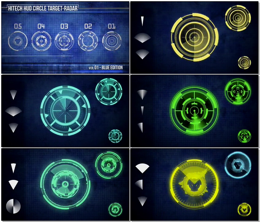 圆形仪表盘主题的HUD全息元素动画素材,模拟了雷达扫描的效果一共包含了5例不同的样式设计,雷达扫描动画共有25种在编辑软件中可以尝试对混合模式、不透明度、旋转值等属性进行调节