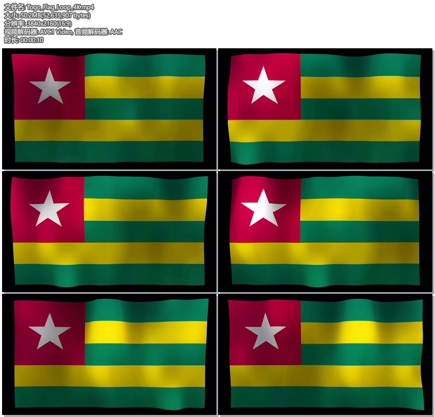多哥国旗4k动态循环股票视频 在这个股票视频中,你会发现多哥的旗帜在循环模式中挥舞。请务必查看我们免费下载的适用于我们旗帜股票视频的Universal Flag Matte视频,以便您可以在您的设计中使用它。