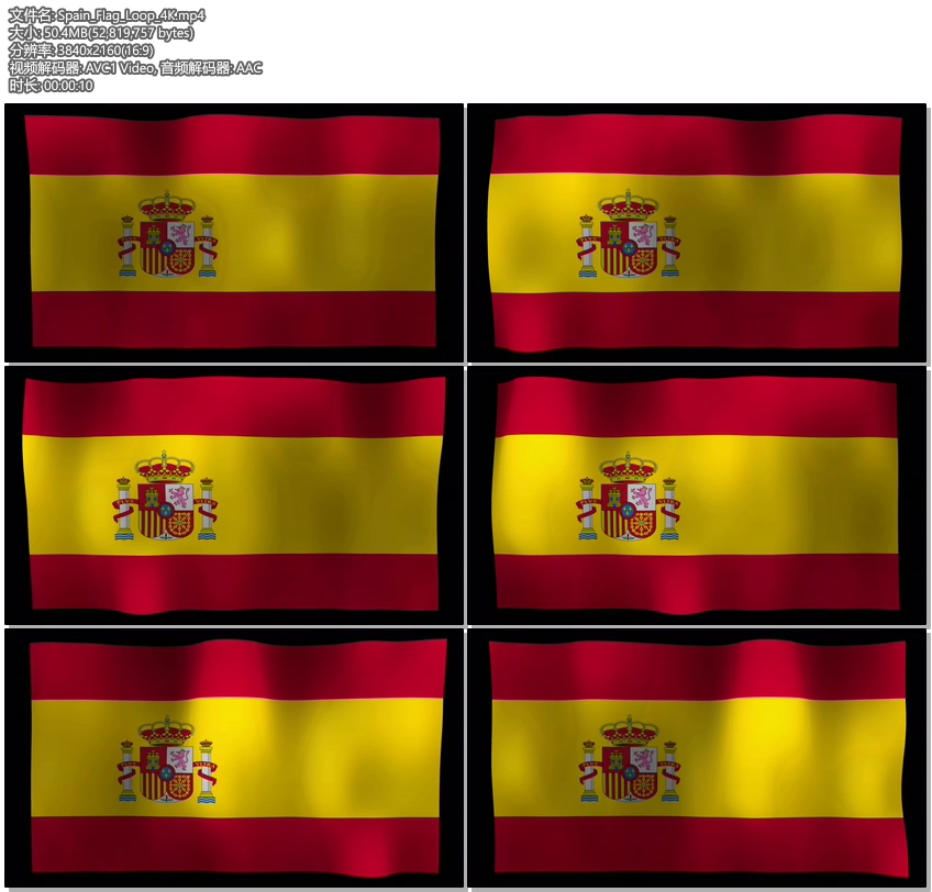 Here in this stock video you'll find the flag of Spain waving in a looping pattern. Please be sure to check out our free downloadable video of a Universal Flag Matte that fits all of our flag stock videos so that you can use it over your designs.