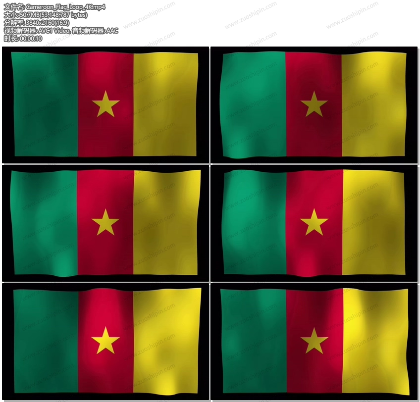 喀麦隆旗子4K行动圈股票录影 在这个股票视频中,你会发现喀麦隆的旗帜以循环模式挥舞着。请务必查看我们的免费下载的Universal Flag Matte视频,该视频适合我们所有的旗帜股票视频,以便您可以在设计中使用它。