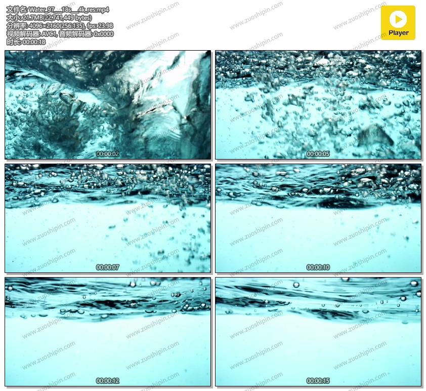 工作室拍摄的透明液体。飞溅和创造泡影的水蓝色场面在清楚的容器。非常适合您项目中的背景或素材中的科学主题。 4K 4096 x 2160 | 24 fps