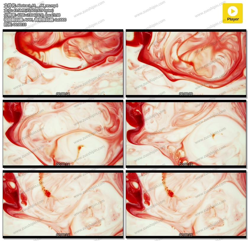移动慢慢地创造任意形状,线和纹理的红色和白色油漆的五颜六色的混合的顶视图。 4K剪辑为您的创意项目或您的镜头中丰富多彩的主题。 4K 4096 x 2304 | 24 fps