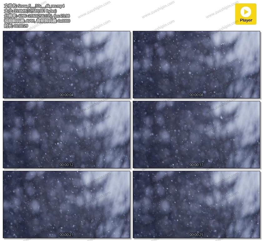 室外拍摄的下雪天。冬季场景在森林里有从左上角落到右下角的雪。适合您的季节项目或您的镜头中的冬季主题。 4K 4096 x 2160 | 24 fps