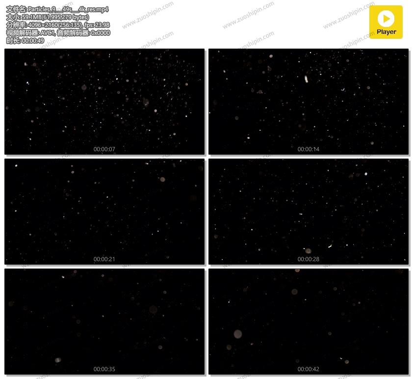 计算机效果的剪辑。金色和白色颗粒在黑暗中缓缓漂浮。非常适合您项目中的背景或素材中的特效。 4K 4096 x 2160 | 24 fps