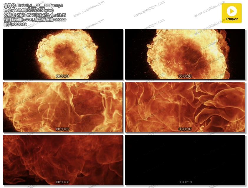 壮观的火点火夹子。火点火创造火球和橙色纹理。非常适合您项目中的特殊效果或镜头中的主题。 2K 2048 x 854 | 24 fps