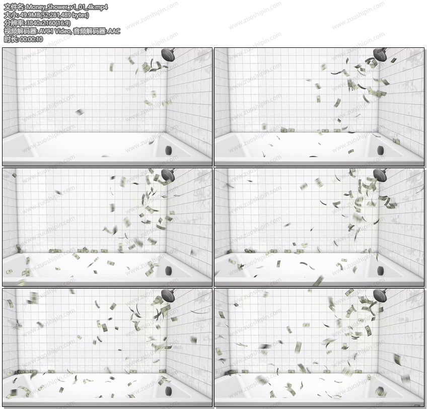 洗澡的钱4k运动图形 这10秒钟的3D动作图形显示淋浴头吐出钱进浴缸。