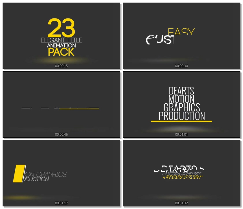 23 Unique Elegant Title Animation project Pack. Ready to use. Each title have IN / OUT animation. Title animation time 6 – 8 sec. 23 separate projects. Very simple to edit text and color. Just drag in to your composition and hit render. You can mix with the others and use as a Kinetic Typography. Preview text edit version included.