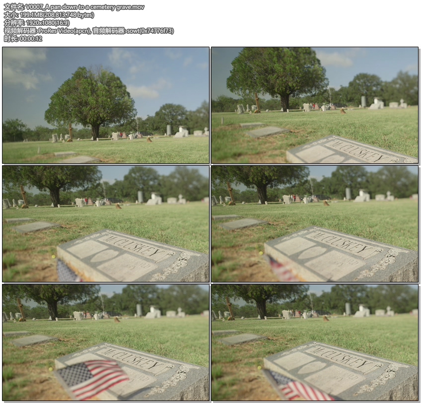 实拍墓地,旁边有一个美国国旗。景深增加了场景的情感。