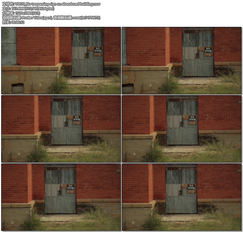 A pan of an abandoned building with a no trespassing sign on it. Boarded up windows and a brick structure.
