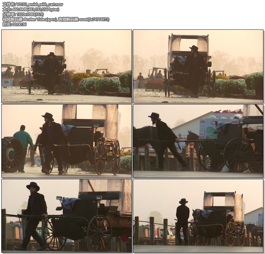 An amish man walks through a village farm pulling a carriage while smiling at others as they pass by and then parking the carriage.