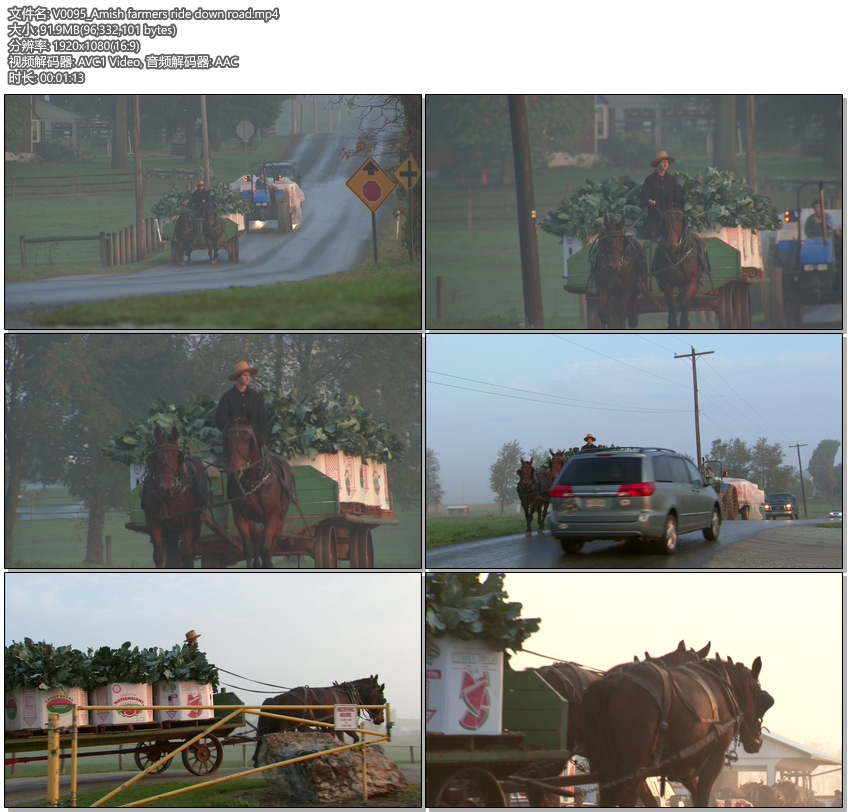 Amish farmers travel down the street carrying their crops. Horse-drawn buggy with 2 horses and a tractor behind it.