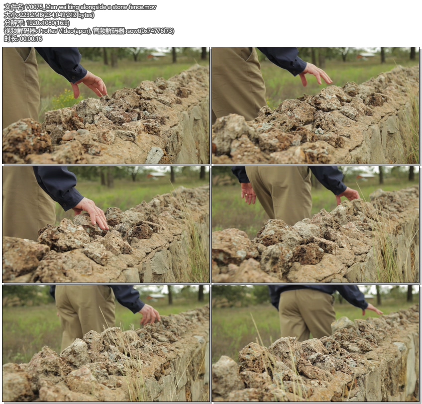 A man is walking alongside a stone fence as the camera dolly's with him.