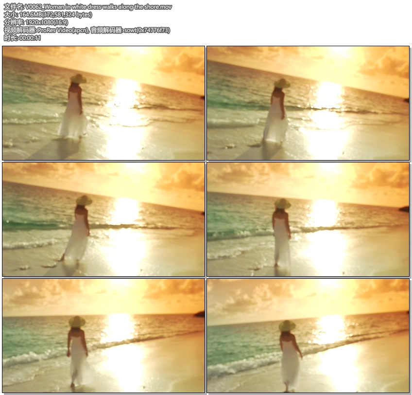 In slow motion a woman walks along the beach at sunset in a white dress.