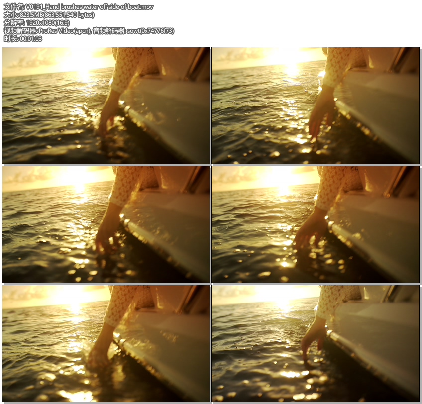 A slow motion clip of a woman's hand brushing the water off the side of the boat as the sun is setting in the background.