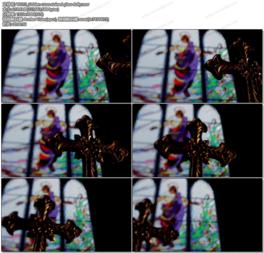 A slow dolly across a golden cross in a church with stained glass in the background.