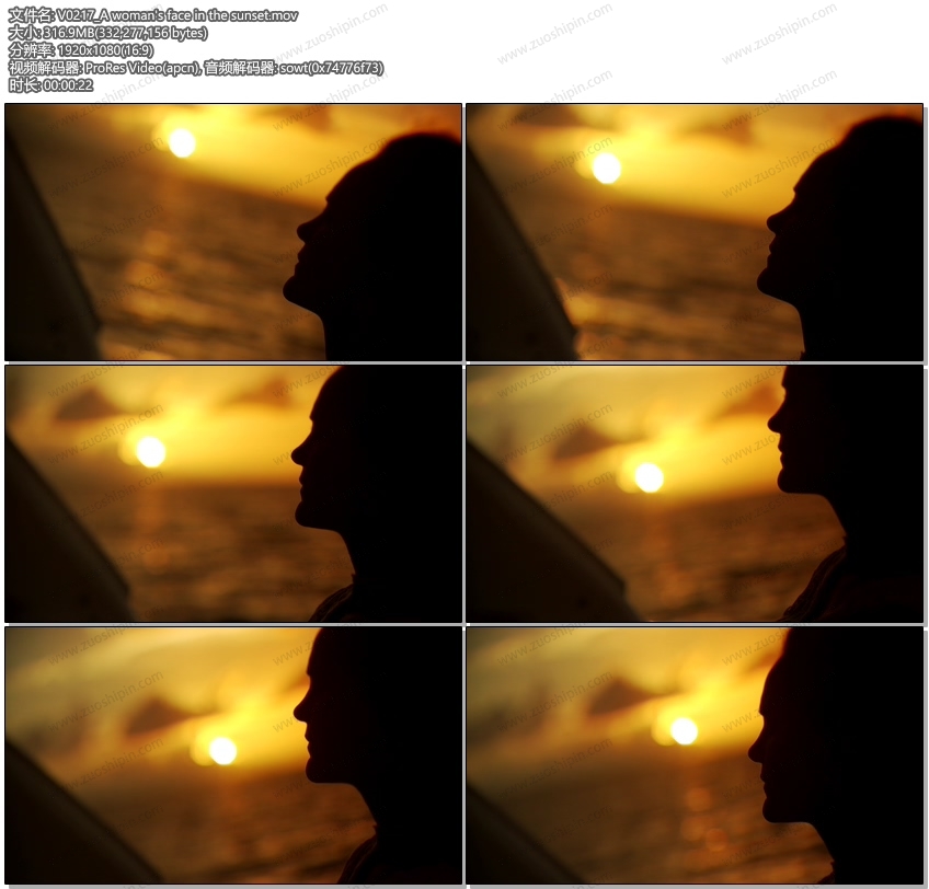 A slow motion close-up of a woman's face with the sun setting in the background. The woman is riding on a boat with an ocean sunset behind her.