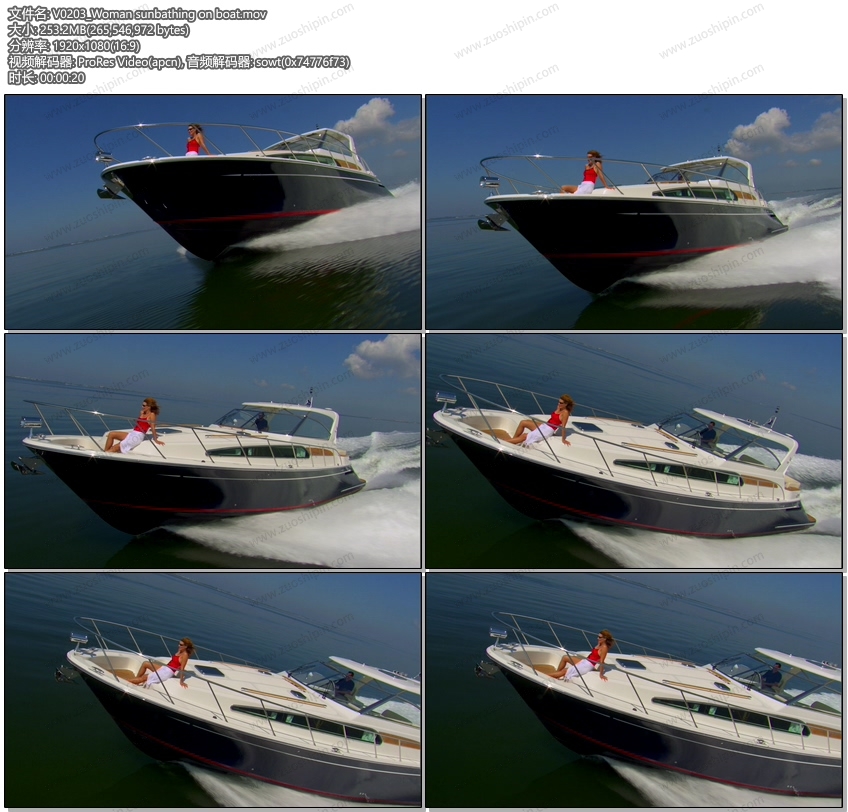 A jib movement of woman sunbathing on the front of a boat while cruising on the water.