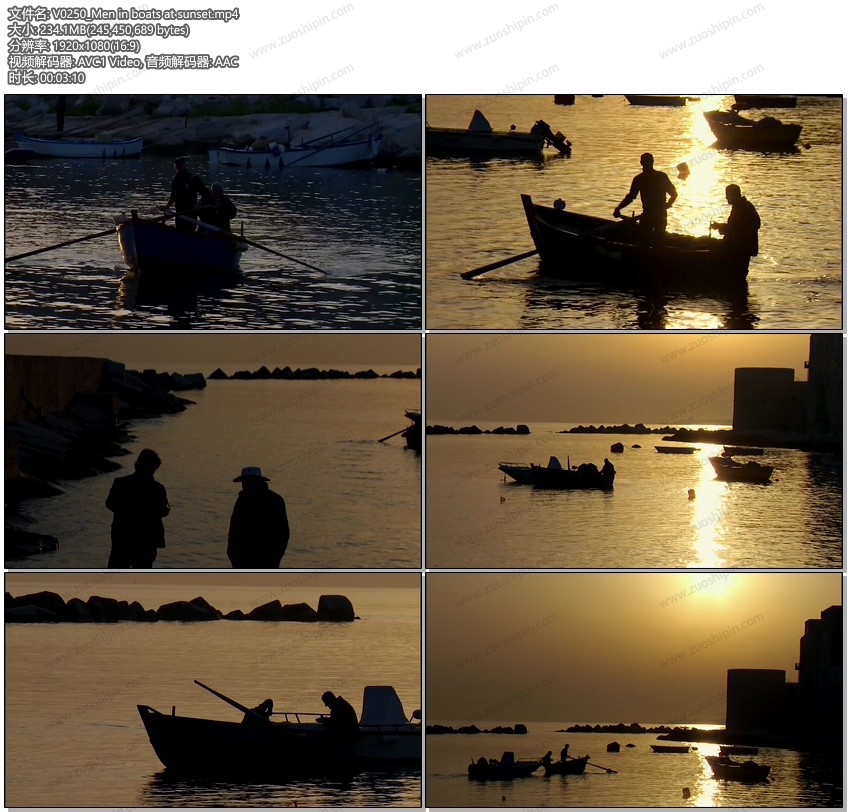 Men navigate boats in a Matera Italy bay during a golden sunset.
