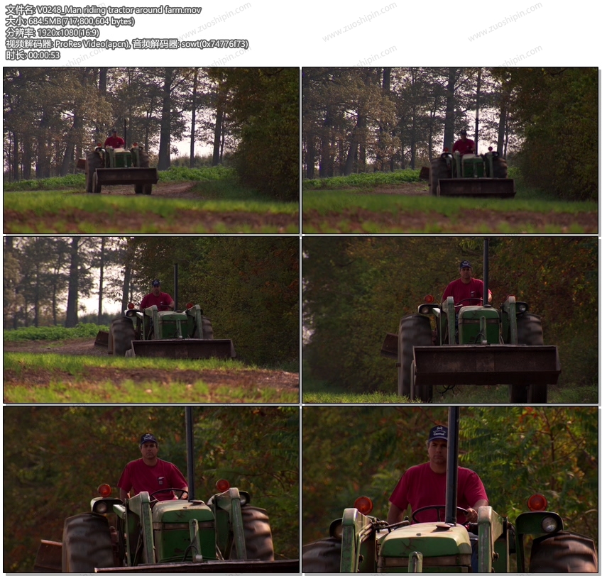 一名男子在农场的一条土路上驾驶一辆拖拉机。