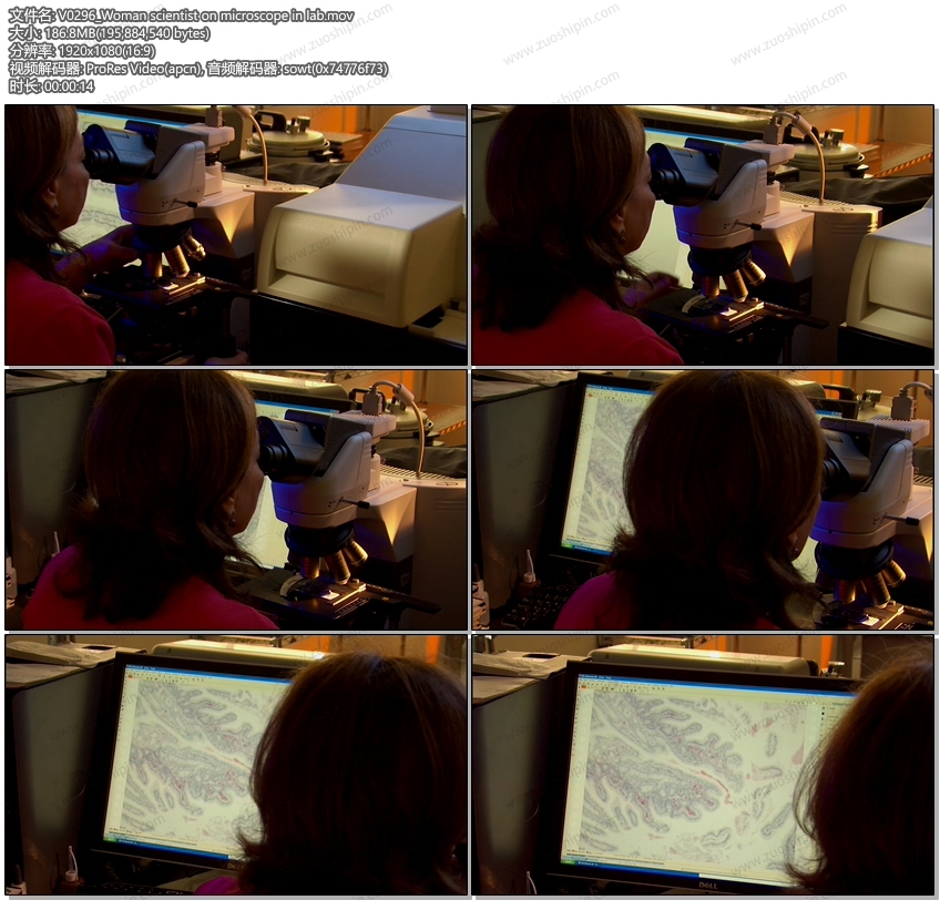 一名女科学家坐在一台显微镜上,看着一张切片,实验内容在电脑显示器上。