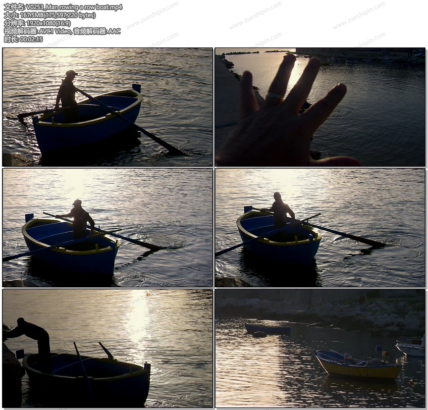 A man rowing a row boat in the ocean as the sun reflects off of the surface of the water.