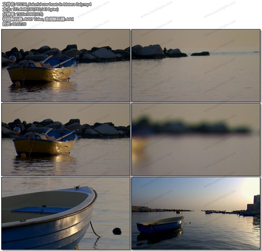 五颜六色船在马泰拉意大利的海洋中平静的漂浮,阳光凝固并反色水面的金色。V0236_Colorful row boats in Matera Italy