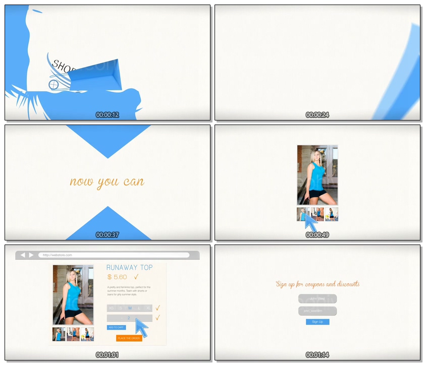 Perfect template for an online clothing store – simply change texts, logo and pictures and you have a very modern and high quality video with 4 important sections: 1. the problem; 2.the solution (your website); 3.how to place an order; 4. join to newsletter.