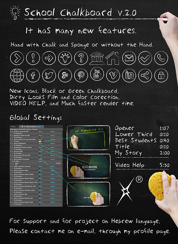 There are new icons and easier way for their implementation in the project. Global Settings: Choose Black or Green chalkboard, choose clean chalkboard or not, choose hand with chalk or not. Dirty Looks Film or color corection.