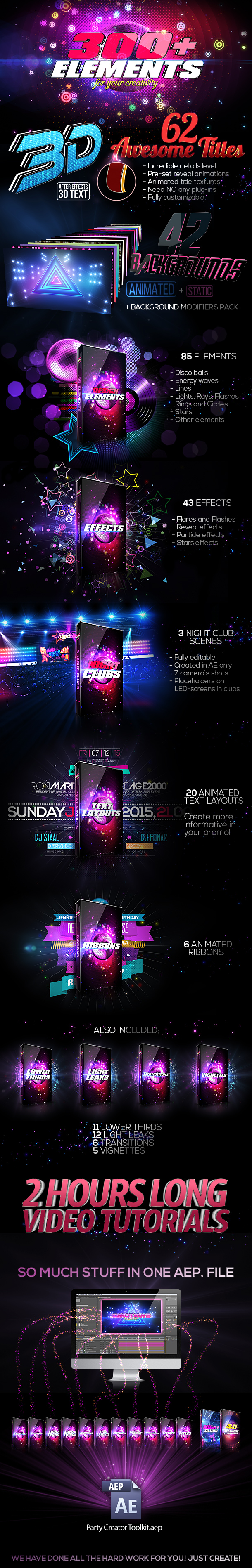 Create your awesome party promo video with this Toolkit! The package also includes 40 high-quality, “ready for use” scene templates with awesome designs. There is over 300 elements, effects, titles, backgrounds, light leaks, transitions, lower thirds, text layouts and more