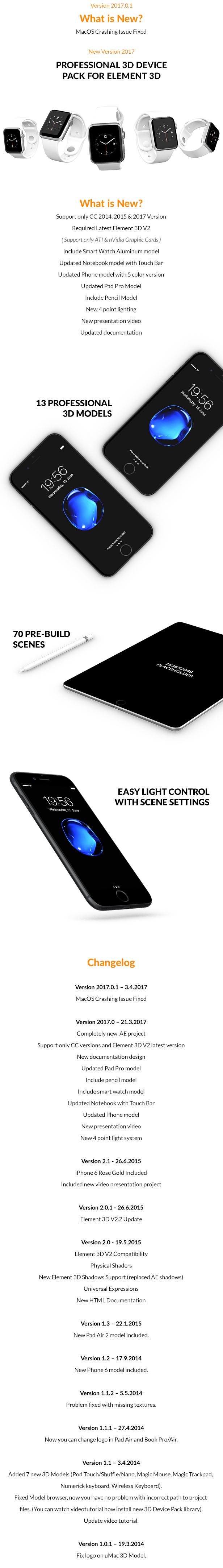 Apple 3D device pack with most popular devices for Element 3D. 13 High quality 3D models for your animation. Work easier and save your time. We have for our buyers 5 stars support.