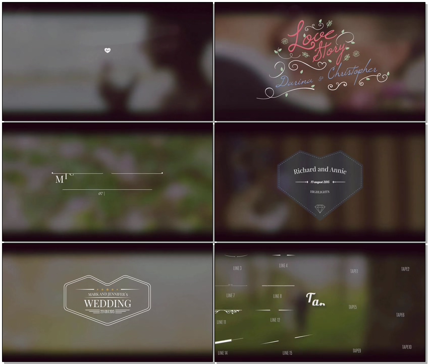 Big pack with animated vintage wedding titles and more than 120 animated elements for compositiong your own, unique titles. Elegant retro titles will add to your video vintage look, surprise your clients or relatives, clean and smooth in/out animation perfectly fit to any kind of projects: slideshow, video, film. It will be perfect opening titles for wedding videos, lovestories, romantic and touching slideshow, photo portfolio, may be great retro label for you lovestory or video postcard on 14 february, christmas, new year, valentine`s day or any other family holidays. Use it like credits in your movie, travel story, adjust it in your own style.Beside there are more than 120 animated elements in project which you can use for adjusting existing 31 titles or for creating new titles. There are 10 main categories with elements and animations: Arrows, Hearts, Dates, Leaf and Branches, Badges, Lines, Tapes, Christmas elements, Text animations and other. Not all elements here already used in main 31 Titles, so you can make a lot of unique stuff. Just be creative! Also you can get 5 Vintage Wedding Titles for FREE