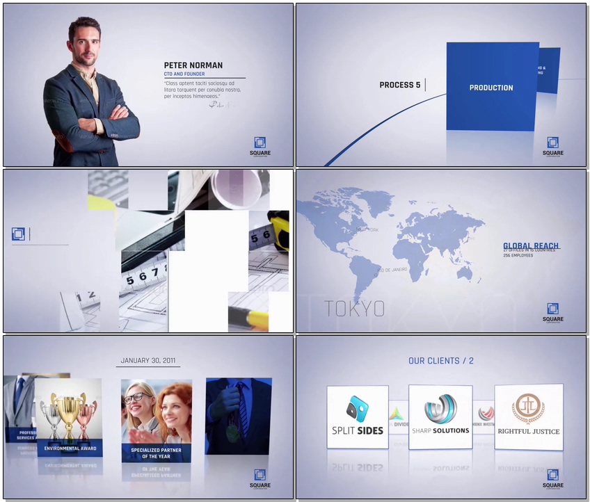 01.Start Logo / 02.About Us / 03.Our Team / 04.Work Process / 05.What We Do / 06.Timeline / 07.Infographics / 08.Our Products / 09.Our Awards / 10.Social Responsibility / 11.Our Clients / 12.Our Contact / 13.End Logo