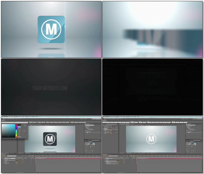 Create a simple, yet dynamic, loge animation with this beautiful After Effects template. It requires no third-party plugins, and is very easy to customize. Simply drop your logo into the timeline, change the text, and render. You can also adjust the color, the logo shape’s roundness, and the logo shape’s opacity with a single click.