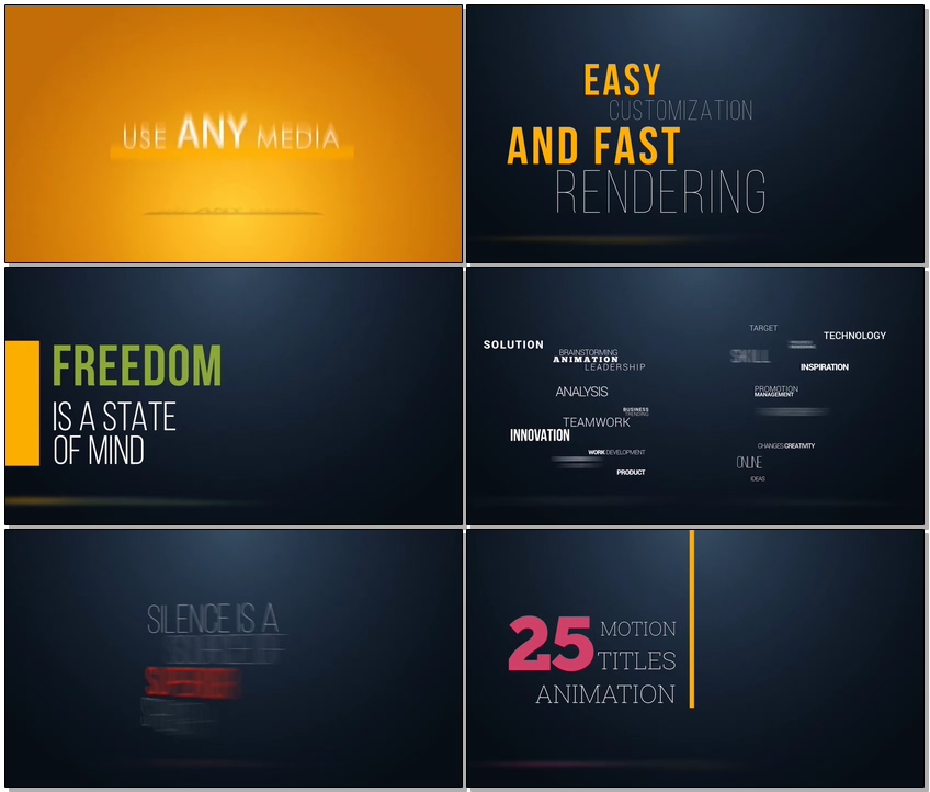 25 Dynamic Title Animation. Each title animation time 6 – 8 sec. Very simple to edit text and color. Edit position, rotation and scale without affecting the animation.
