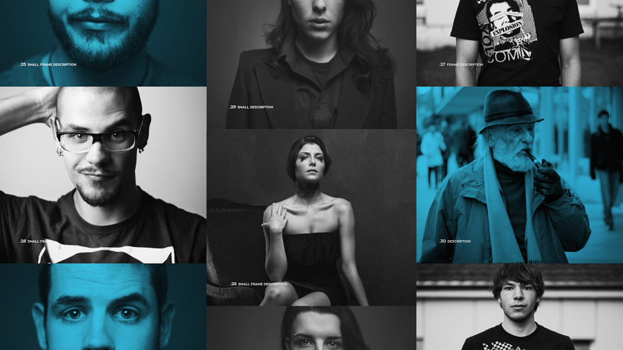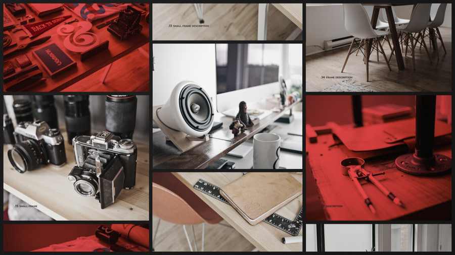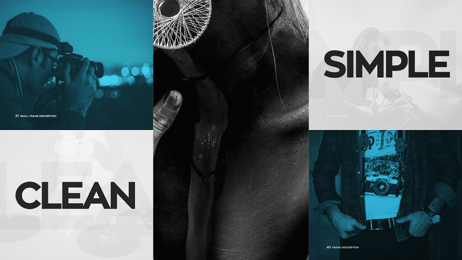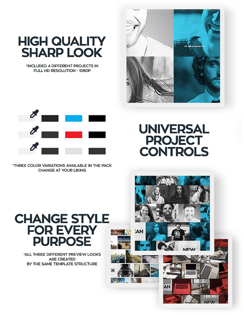 - All three examples in the Preview Video are created by the same Project Features (means that you can make the 1 min version on the preview look like the 16 sec version or the 35 sec version, and the other way around). You can change all Controls and create different looks: bold, elegant, minimal, just change the size of the frames. Also there are a number of other Features (Universal Controls) that you can modify, like Title Animation Fade-IN Angle, Title Solid Background Color/Blur/Brightness, these are all option that you can change Universally, and combine the different attributes each time you use the Slideshow.