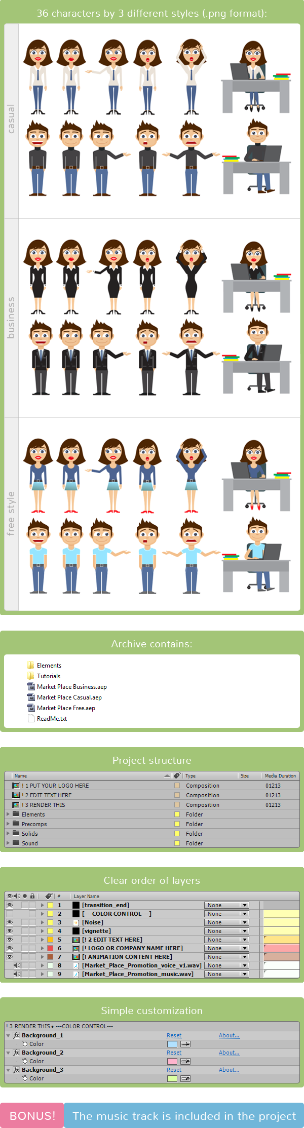 The project includes 36 characters and 3 different styles of presentation: casual, business, and free style.