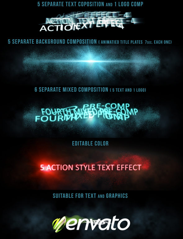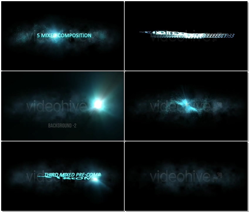 – Separate compositions of : 5 text effects , 5 animatied backgrounds, 6 Pre-Mixed ( Text and Background )