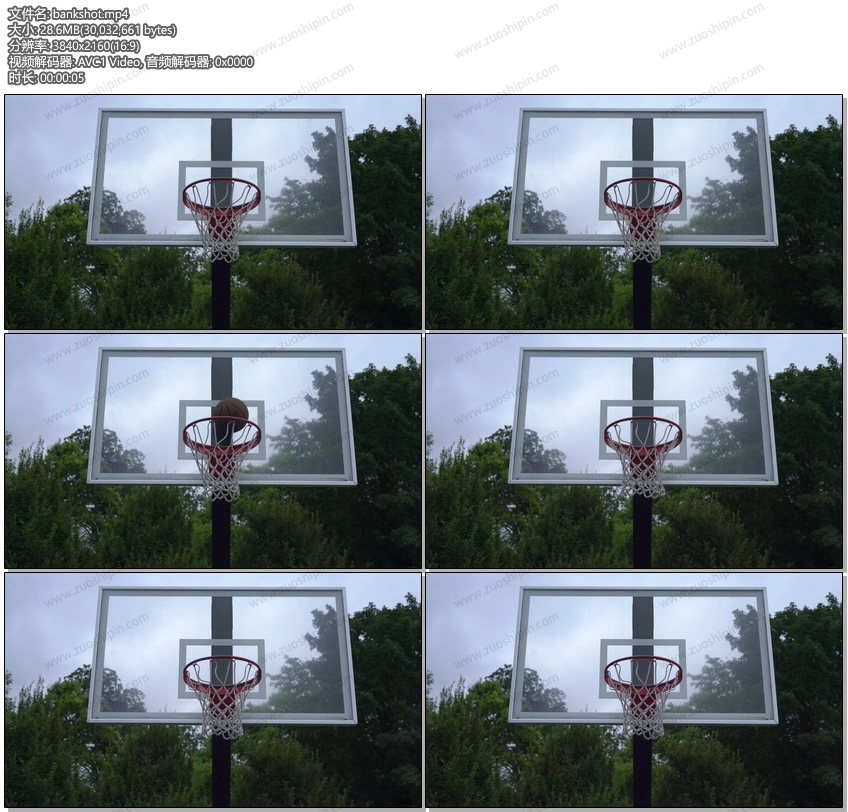 View of basketball goal from front with basketball hitting off backboard and going into net.