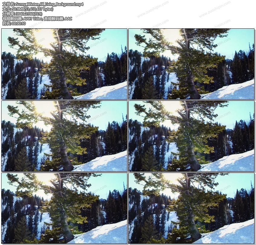 晴朗的冬天4K生活背景 发光通过在冬天降雪的一棵树的太阳的4K生活背景。
