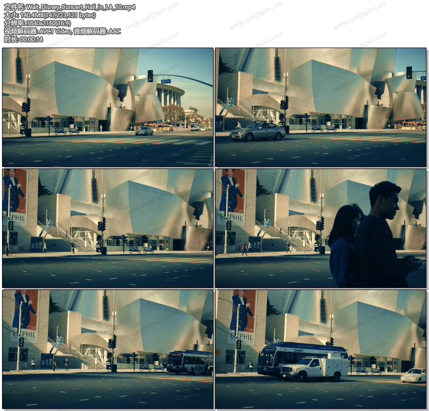 Horizontal panning shot going left of the frontage of Walt Disney Concert Hall at Los Angeles. Panning shot of the frontage of the Walt Disney Concert Hall with vehicles in transit, people walking on sidewalks and crosswalks. Ideal for your urban film projects or Los Angeles topics in your footage. 4K 3840 x 2160 | 30 fps