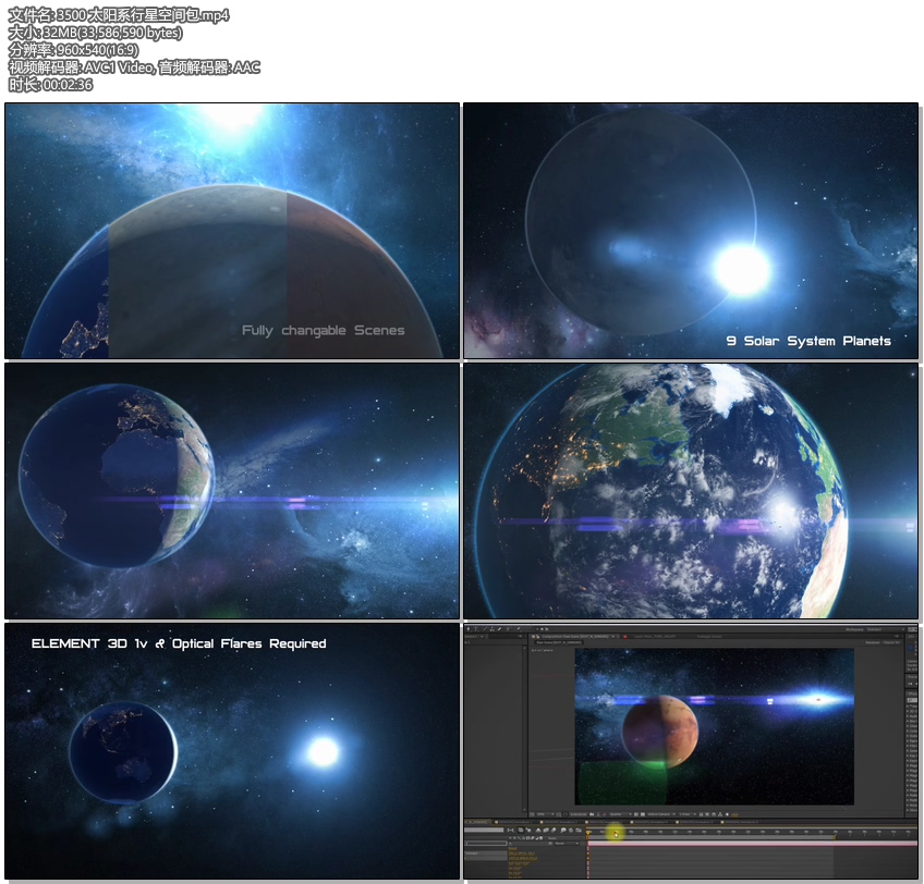Space Pack with planets of Solar System was created to give an opportunity to create beautiful epic space scenes and animations using Element 3D, Optical Flares inside After Effects. There are no prerendered elements. Each element can be transformed and modified, changed and displaced. Sun Flare can be changed as well as it’s color. Expression Control will make this task much easier. Planets can be moved, rotated, scaled by these controls. This pack uses real textures with normal maps (Relief). You can move, scale or change each Nebula on background. Videotutorial will help you to modify this project easier.