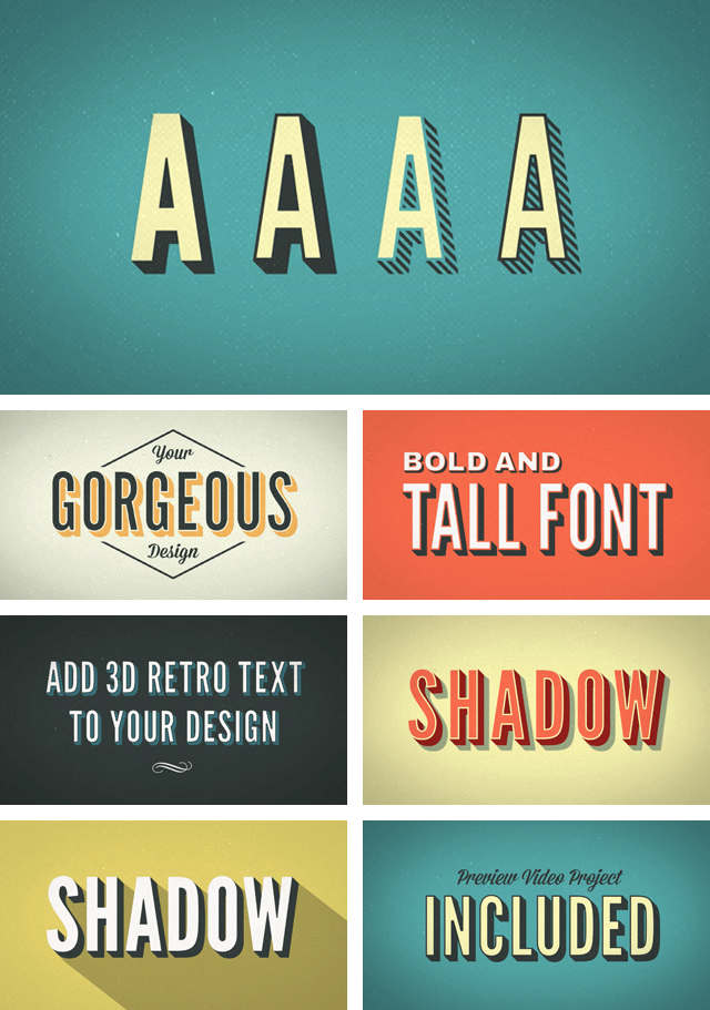 Animated 3D Retro typography template with custom controls. This template allows you to add 3D retro text to your imported design and customize the retro text with your own message. Change letter styles and colors using the effects panel. Must use the font shown in the previews (The characters/letters are pre-rendered animations).