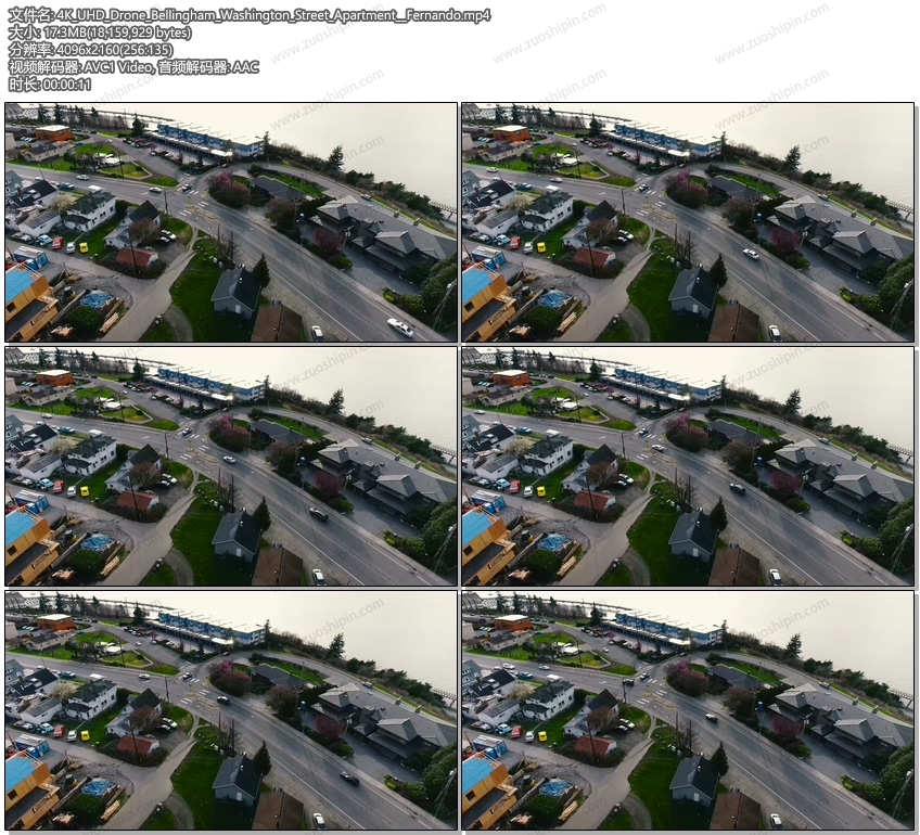 Aerial video of a busy road on the edge of neighborhood. Cars can be seen driving down the road. A large home that is under construction can be seen in the corner. A body of water can be seen on the edge of the neighborhood behind some large apartment buildings.