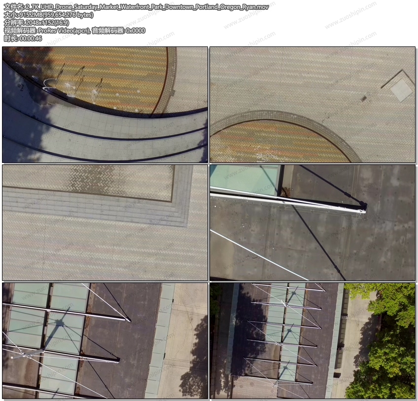 Aerial drone footage over a brick walkway, water fountains can be seen coming out of the ground in the beginning and near the middle of the clip.