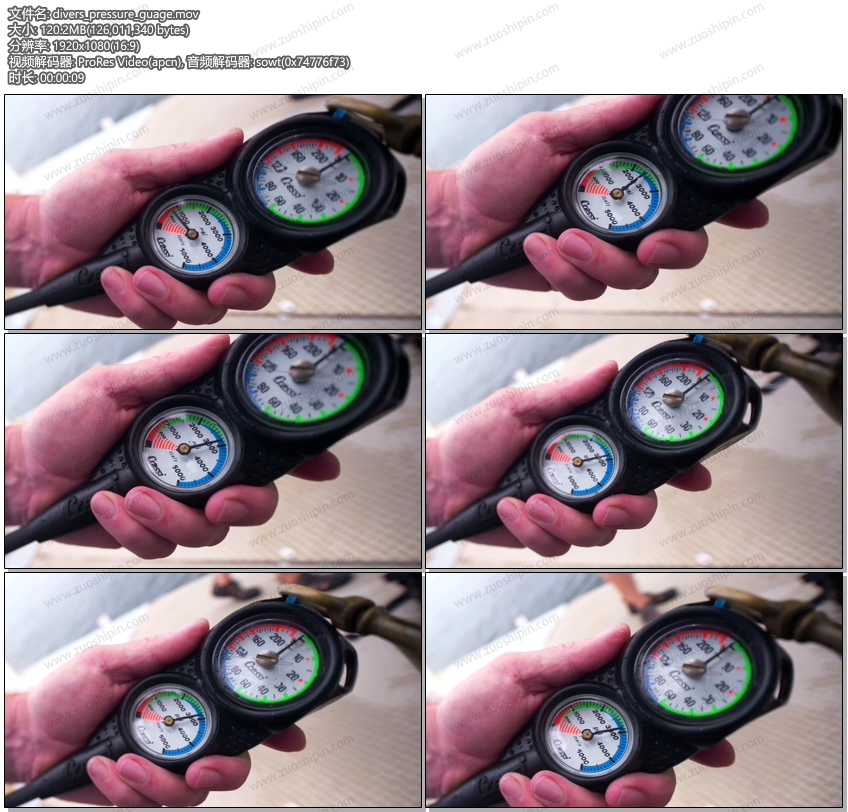 A divers air pressure gauge close-up in slow motion with a shallow depth of field.