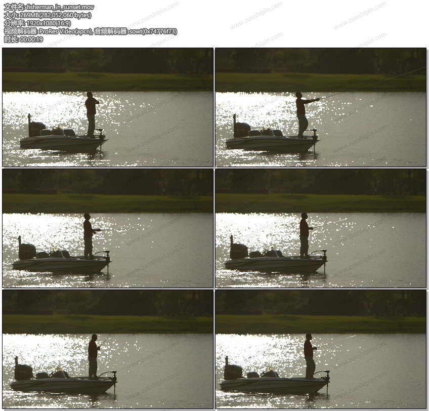 渔夫在日落 一个男人在湖边的船上钓鱼的慢动作剪辑,因为太阳正在他身后。