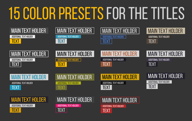 - 15 color presets for the titles. Just copy parameters from preset to customize layer.