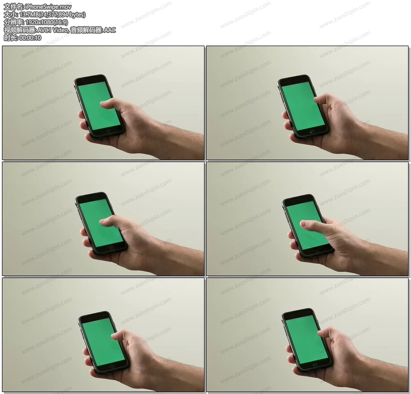 这个色度键/绿色屏幕准备工作室拍摄允许您将自己的屏幕截图放在手持iPhone 6上。手拿着iPhone垂直握住它并使用拇指左右滑动。