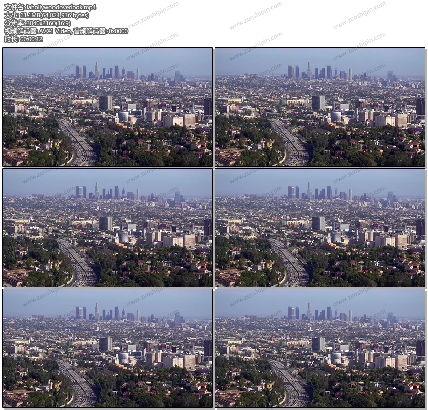 This video contains a view of downtown Los Angeles as seen from an overlook in Hollywood, California during the day.