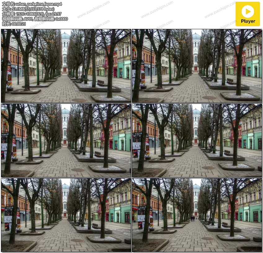 时间流逝的小型城市公园,两侧有彩色建筑物。希望你能在项目中使用它。